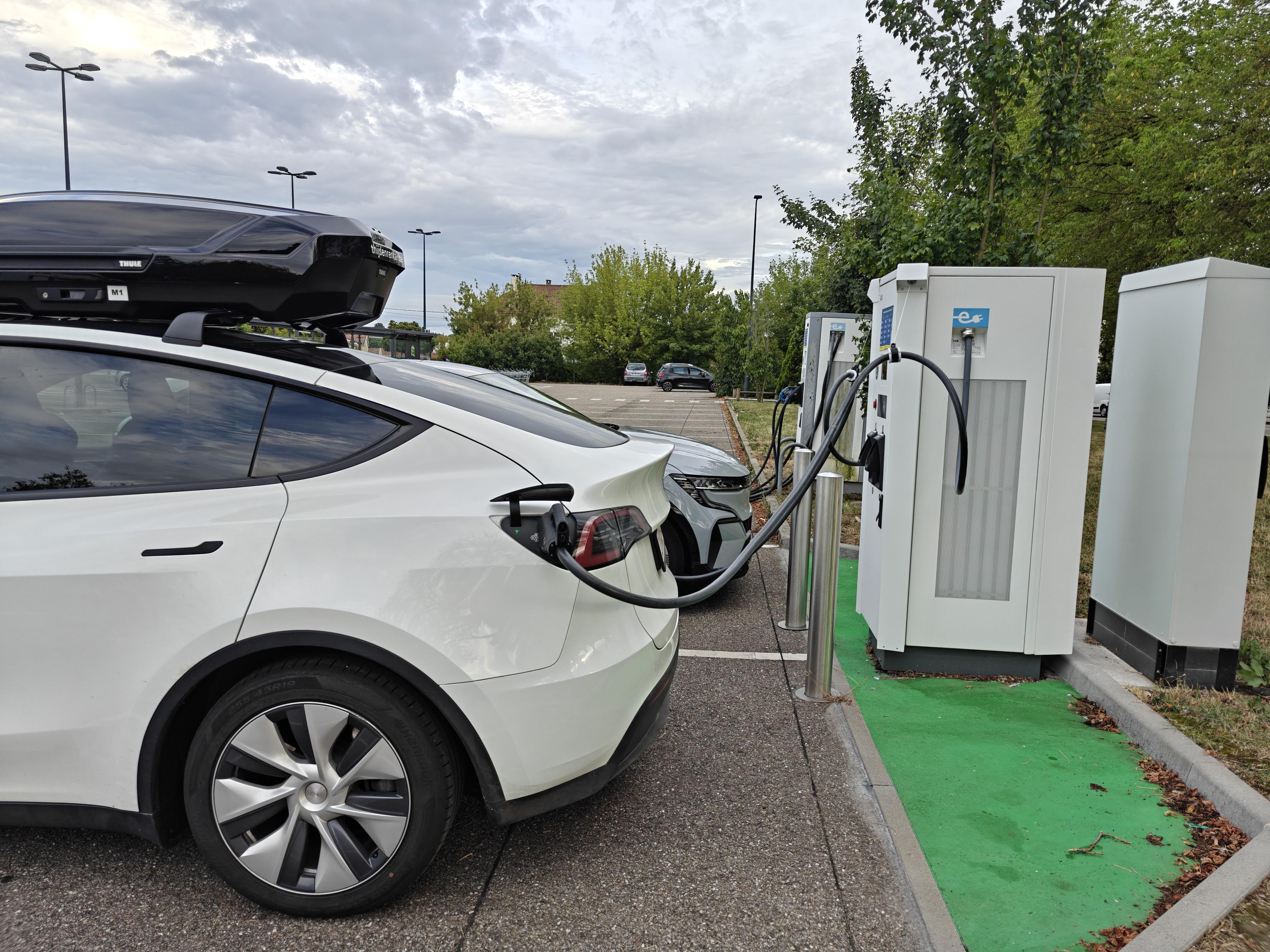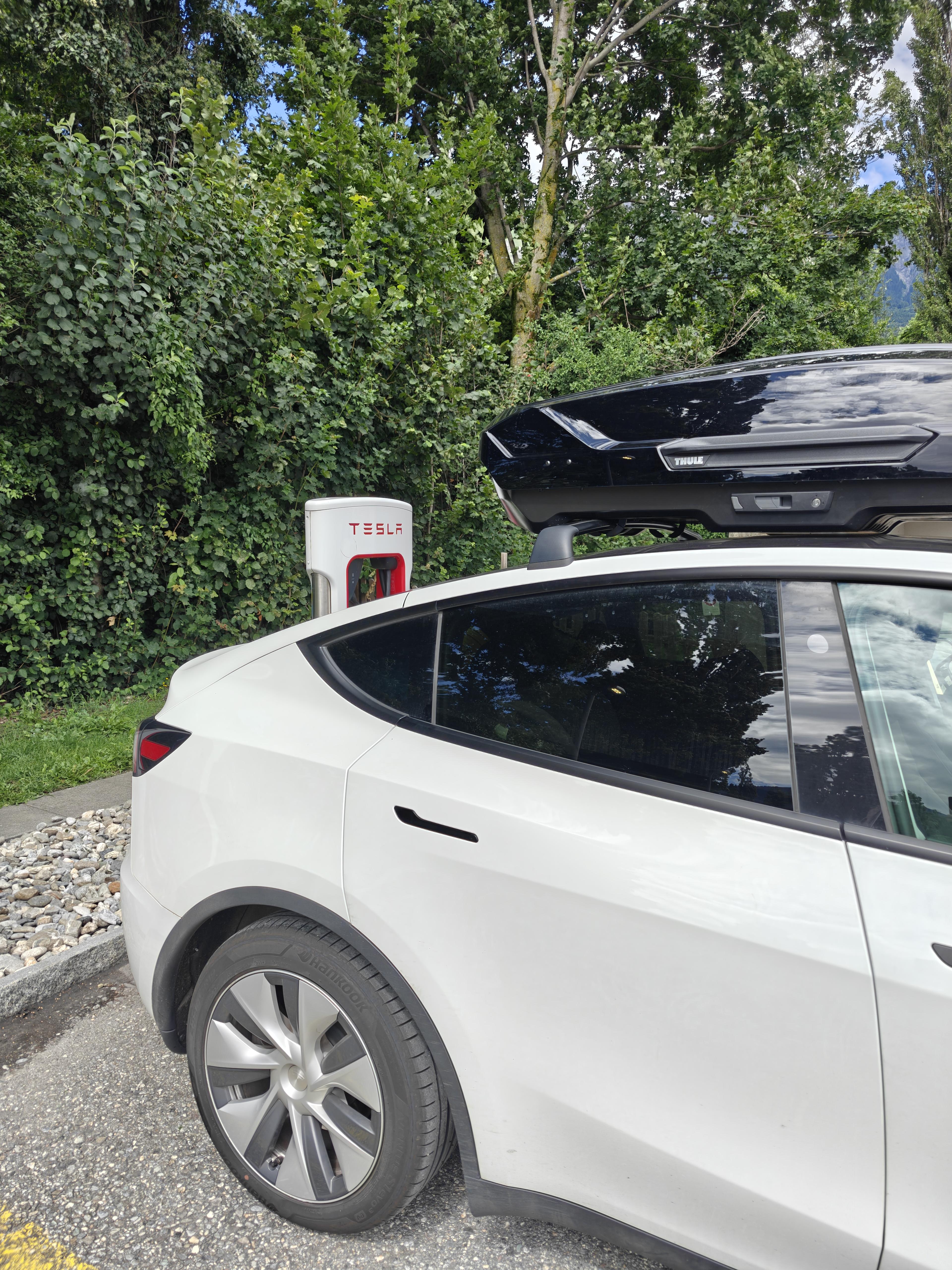 Die dakkoffer had minder impact op het verbruik dan we eerst dachten. We bereikten Metz (270km) zonder laadstop met zo’n 40% batterij, zonder onze rijstijl echt aan te passen. Daar laadden we ’s avonds op een twintigtal minuten vol om de volgende dag de verplaatsing verder te zetten. Onderweg laadden nog zo’n 40% bij tijdens een lunchpauze, en ongeveer 20% tijdens een korte plaspauze, waardoor we nipt onder de 20% lading doken bij aankomst in St. Moritz.